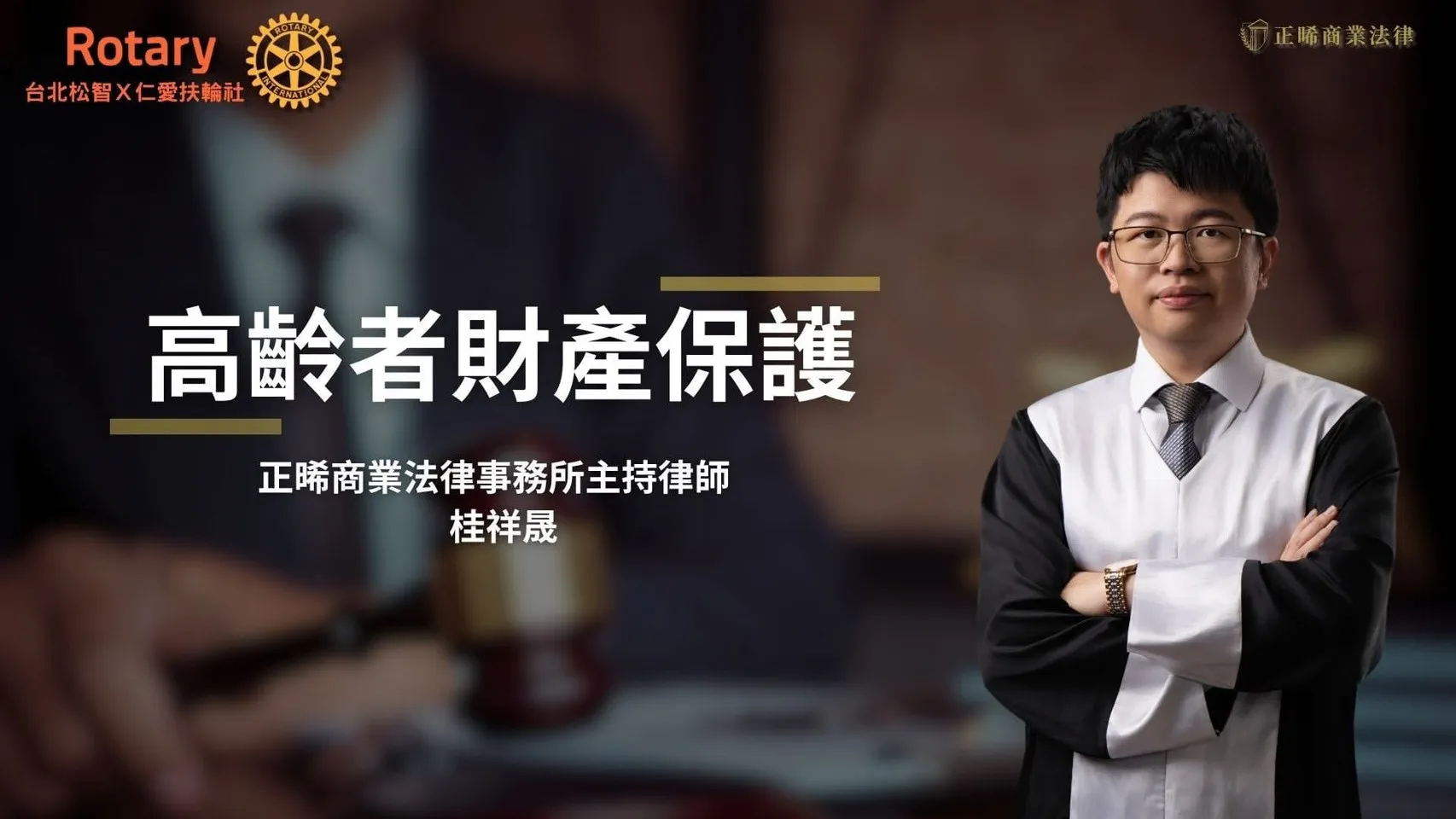 本所桂祥晟律師於11月21日受仁愛扶輪社前社長胡昭安引薦,仁愛及松智扶輪社聯合例會邀請,擔任來賓講授「高齡者財產保護」。現場超過60位台北市各界菁英的社友齊聚一堂,一同瞭解子女在家中長輩面臨中風或失智時,如何維持長者照顧不中斷,又可避免或解決兄弟姊妹競相爭奪家產的危境。