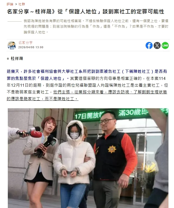 自由時報-名家分享~桂祥晟》從「保證人地位」談剴案社工的定罪可能性